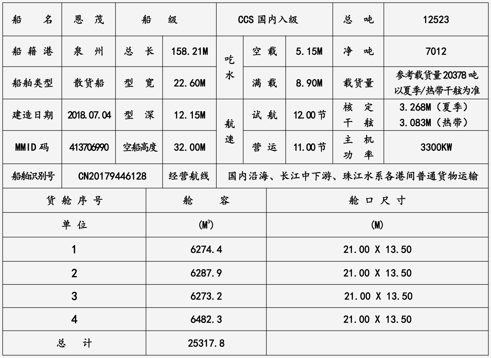 船 級(jí):CCS國(guó)內(nèi)入級(jí)